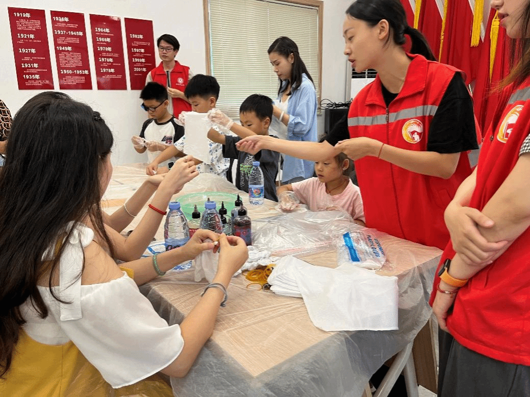 随后,志愿者细心地为大家讲解扎染技法和技巧,从折叠布料、捆扎到染色的每一个步骤都进行了详细的说明。参与者们领取了扎染材料和工具,志愿者们则耐心讲解了扎染的技法和技巧。在志愿者的指导下,参与者们开始了扎染创作,他们自由发挥,将一块块白布变成了色彩斑斓、图案各异的扎染作品。