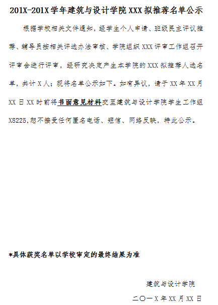 3.推荐名单院内公示(公示期三日),公示形式两种:发布学院网站;纸质版张贴学院办公楼、宿舍楼等公共区域。
