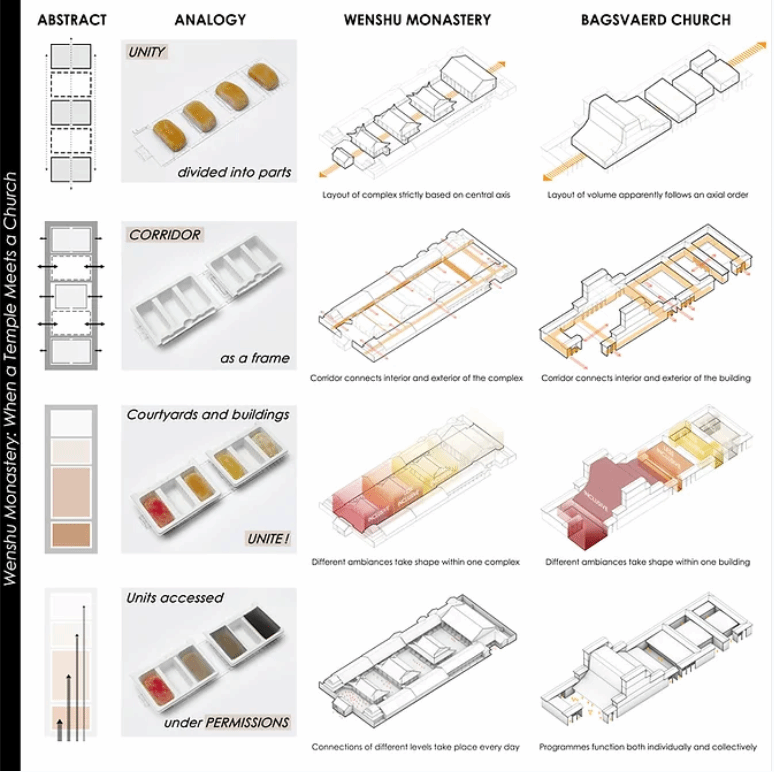 师生团队的论文《文殊院:当寺庙遇见教堂》很好地呼应了temple内涵的国际性和多样性。文章打破建筑史叙事常规,从建筑空间角度总结了四条设计原则,比较分析了不同文化背景下传统寺庙和现代教堂在形式逻辑和使用功能上的共性。