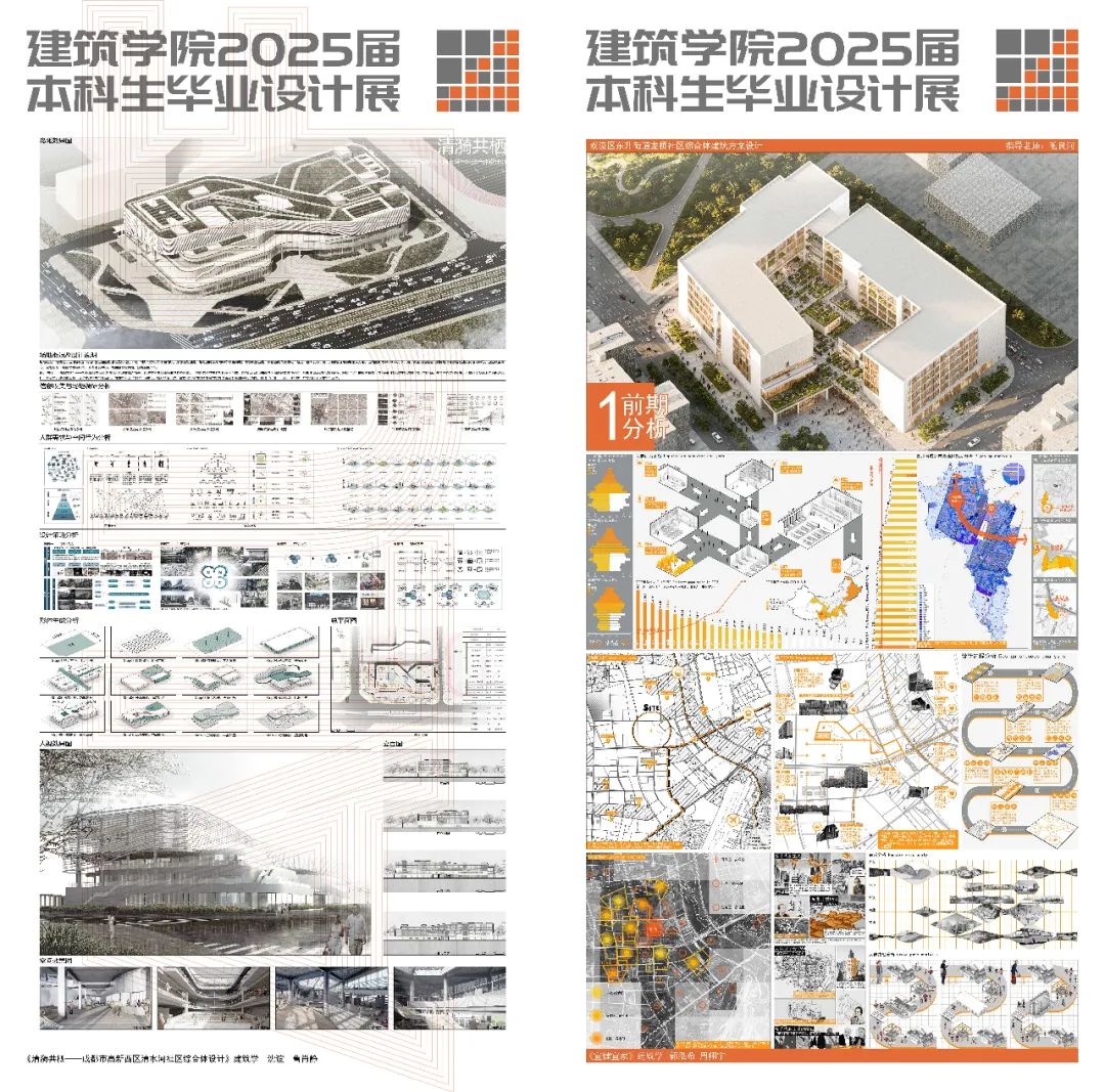 同学们通过模型、图纸与数字化成果,多维度展现设计思考:在适老化社区与历史街区活化领域,既有模块化建筑与共享理念结合的创新思路,也有以西南地域文化为脉络、探索传统营建智慧现代转译的在地性实践;区域协调发展主题下,成渝双城经济圈功能联动策略研究、川西传统村落保护与发展实证分析等作品,彰显建筑类专业服务国家战略的独特价值;生态建设方向呈现兼顾生态修复与场所精神营造的设计实践,如城市棕地再生的景观叙事重构、天府绿道网络的功能优化等创新方案,更有团队运用参数化技术平衡自然形态与人工环境,或基于"海绵城市"理念构建气候适应性景观系统,展现应对环境挑战的前瞻视野。