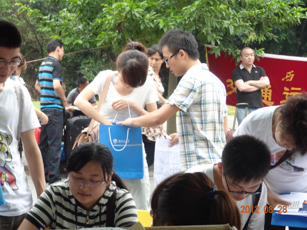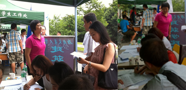 今天有不少同学都是独自一人从很远的外省来学校报到的,这样独立的学弟学妹让人敬佩。而另外还有一部分同学就是全家齐上阵,让迎新点非常的热闹,充满生气。有个来自重庆的同学是由妈妈,爷爷还有表弟陪同前来的,一说到孙子考上大学,爷爷的嘴就合不拢来,十分自豪。妈妈说12岁的表弟本来是要开学了,但他非要来送哥哥进大学。胖胖的小表弟在一旁十分可爱的说:“哥哥的学校比我的学校大多了,以后我也要来这儿读书。”