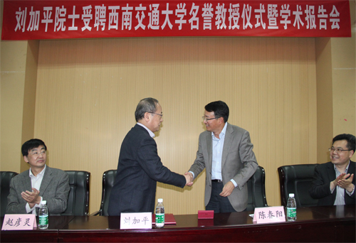 校徽。陈春阳校长在讲话中表示,西南交大非常欢迎刘加平院士的到来,感谢刘加平院士能够来交大参与工作指导,并表示会为刘院士创造优越的工作条件。