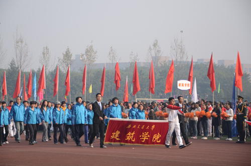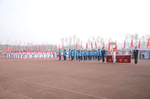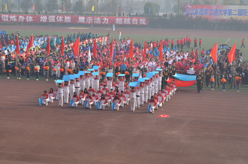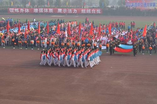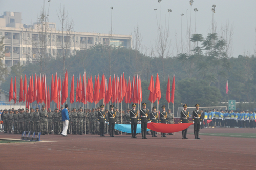 校歌,校运会开幕式正式拉开序幕,由国防生组成的国旗队以及队旗方阵首先入场。国旗庄严艳丽,国防生队员军姿挺拔,金色朝阳下,他们的飒爽的英姿令在场师生仰慕。