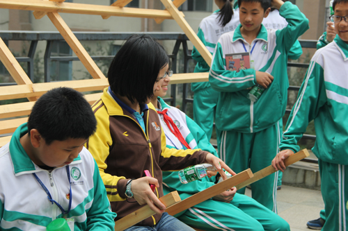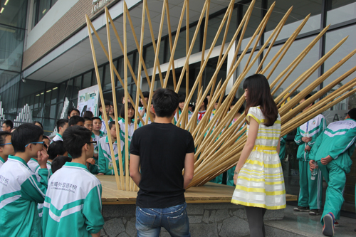 的志愿者为参观师生详细介绍了各个参赛作品,包括方案设计、设计理念、材料选取、施工过程等。同时也为他们普及了相关的建筑知识,参观师生也兴趣盎然,不断在作品间探索穿行,感受充满创意的文化艺术氛围。