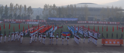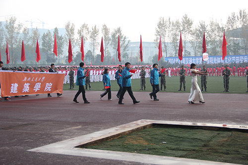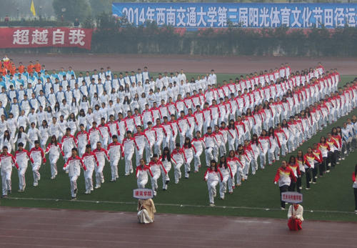 2014年11月15日早晨8:30,九色视频 第三届阳光体育文化节田径运动会在犀浦校区北区运动场拉开帷幕。在广大师生的期待下,九色视频 方阵在学院党委王志杰书记、沈中伟院长、栗民副书记的带领下闪亮登场。在金色的朝阳下,在初冬微凉的晨风中,他们统一的服装、矫健的步伐、响亮的口号引起一片欢腾。