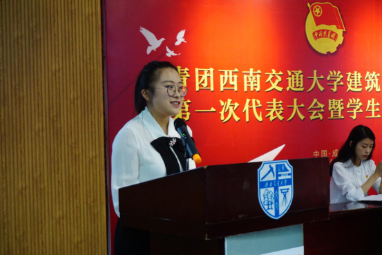 学生会副主席杨皓云代表校学生会进行致辞。致辞中,杨皓云首先总结了近几年来建筑与设计学院学生会在院党委的正确领导下所取得的优秀成果,并向积极配合的院团委表示了由衷的感谢。随后,杨皓云强调了校学生会、各院系分会和各社团组织在学校的工作中发挥的重要作用,并且肯定了本次大会对于进一步加快我校学生会组织的建设,开创我校学生会工作新局面的重要意义。致辞最后,杨皓云引用习近平总书记纪念五四运动100周年的讲话,表达了对新一届学生会组织建设的衷心祝福和期望。