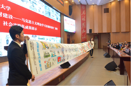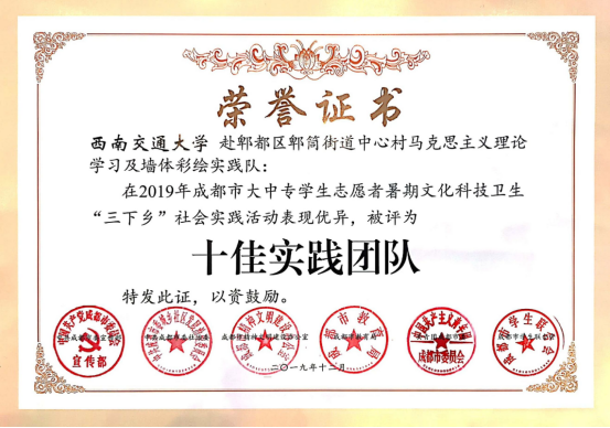 2019年暑期“三下乡”赴成都郫都区郫筒街道中心村“特色乡村建设——马克思主义理论学习及墙体彩绘”实践团队在1139支团队中脱颖而出,被评为成都市“十佳实践团队”称号,团队指导老师被评为“十佳指导教师”称号,本年度十佳队伍共计10支、十佳指导教师10人,来自多所高校,我校团队代表在会上做风采展示。