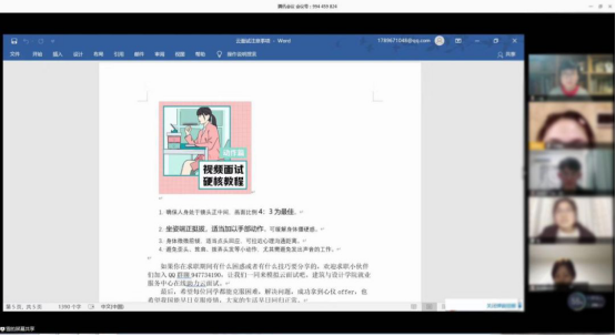 最后,王雪老师关于毕业班就业情况进行了介绍,她介绍到:疫情期间云面试中同学们可能存在不少问题,指导中心会及时做好就业指导工作。将云面试注意事项以形象篇、动作篇、操作篇、环境篇、表情/语调篇及设备篇六部分为大家一一举例说明。同时,学院就业服务中心将在疫情期间在线助力云面试,开展在线求职帮扶活动,增加云面试通过率。并建立了求职信息QQ群,在群内分享云面试技巧以及带动同学们关于云面试信息的分享交流,以及对有需要模拟云面试的同学提供在线模拟。