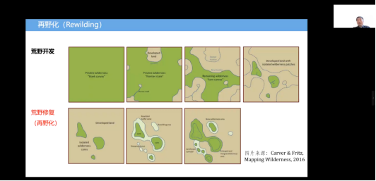 讲座的第三部分题目是“荒野与再野化”,杨锐教授从“大地景观”、“物种栖息地”等视角说明了野性的消失与后果,并从“2020年后全球生物多样性框架”中,梳理了保护“荒野地”的重要作用,同时从“全球尺度”、“国土尺度”、“区域尺度”展示了其团队多年的“荒野地”研究内容与成果。此后,杨锐教授对“再野化(Rewilding)”的概念进行了细致的阐述并对风景园林学、地球系统科学、保护生物学、地理学、生态学、城乡规划学等多学科在“多尺度荒野保护支持可持续发展”领域的研究和实践进行了展望。