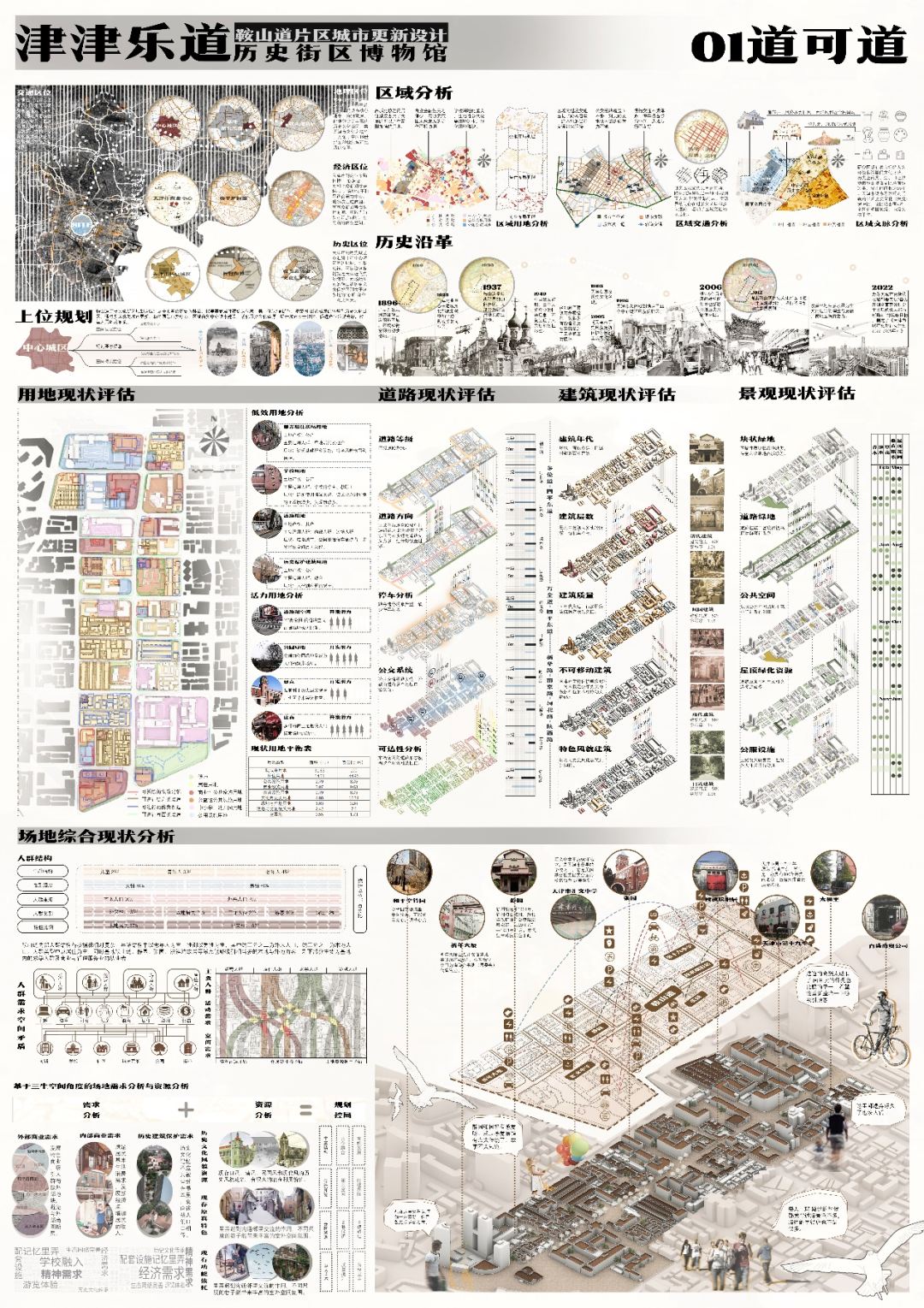 设计说明:场地选址于天津市和平区鞍山道片区,基于场地三生空间的分析,以居之道、游之道、自然道、道中道、商之道和学之道6个策略,实现对场地居住商业等的改造,置入触媒点,打造新流线,综合打造混合集约、体验丰富的街区博物馆,使得街区呈现出历史博物馆的特色,实现街区历史文化资源的丰富与再利用,教育文化资源的升级与拓展,居住特色的发扬和保护,商业资源的发掘和培养,绿色资源的开发与设计。