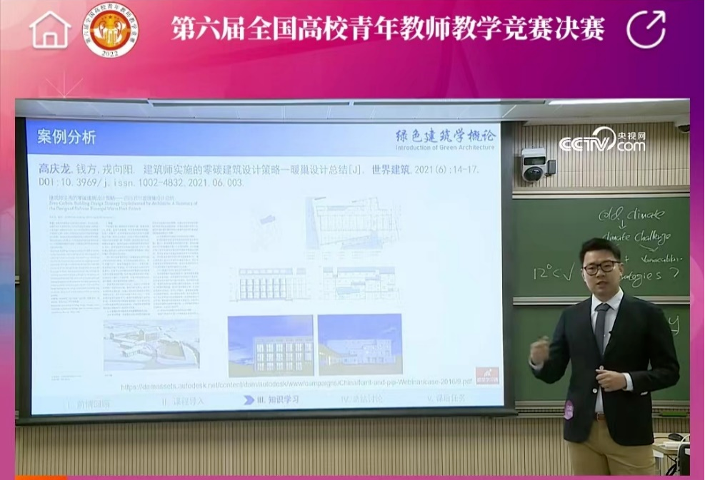 宣湟老师课程设计严谨,逻辑清晰,20分钟的讲授行云流水,一气呵成,扎实的专业功底和深厚的文化积淀感染着每一位来到他绿色建筑的课堂的听者,跟随他一起思考一起设计一起解决问题。特别当他说“……让孩子们的小手不会再长冻疮,……,这其中,体现的是方法,更是责任”时手指胸口,那一瞬,唯有感动。宣湟老师为竞赛16 个节段准备了两大箱教具,有从世界各地带回来的传统民居模型、克罗地亚陶瓷罐、固碳混凝土、热致调光玻璃等等,他将这些教具外加一台走步机全部带到了赛场。一个个教具不仅是教学设计的精妙巧思,还记录着一段段旅程和感人的教学故事;十几万字的竞赛讲稿是300个日夜反复磨课的见证,无不展现着他对教学的专业执着与专注,观摩的老师表示从他的授课中深切感受到了专业教师的大爱与担当以及有温度的新工科教学。