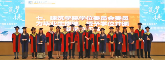 在悠扬的音乐声中,学院学位评定分委会委员为毕业生拨穗、授予学位,并合影留念,将典礼的气氛推向高潮。