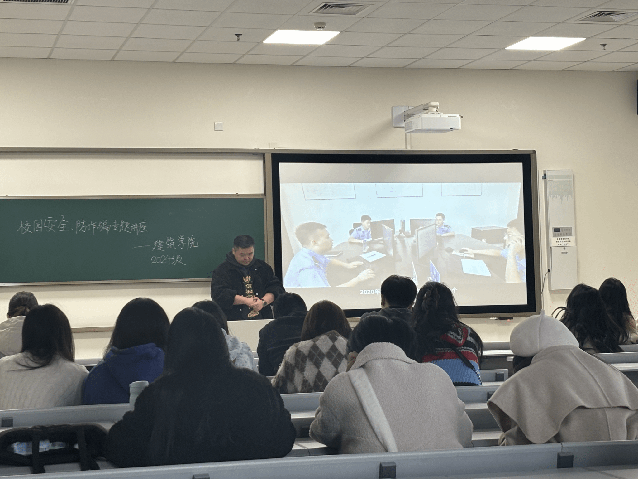 讲座开始前,辅导员王振世老师上台,对出席讲座的两位资深讲师——保卫处的李为群老师和曾轲老师进行了简要介绍,并向他们表示了热烈的欢迎和衷心的感谢。