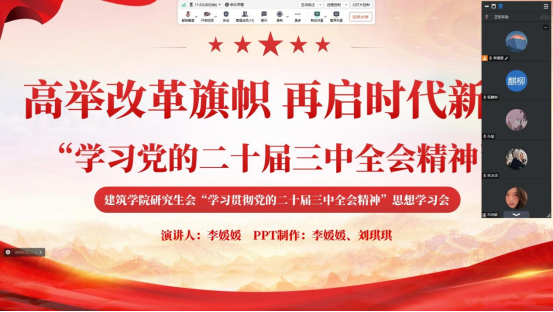 研究生会通过线上会议的形式成功组织开展了“学习贯彻党的二十届三中全会精神”专题学习会,全体研究生会同学参与了此次线上学习。