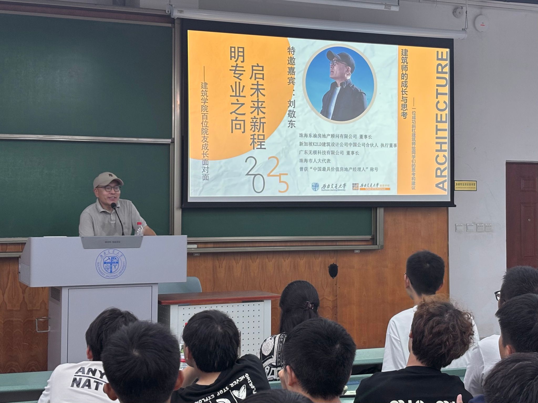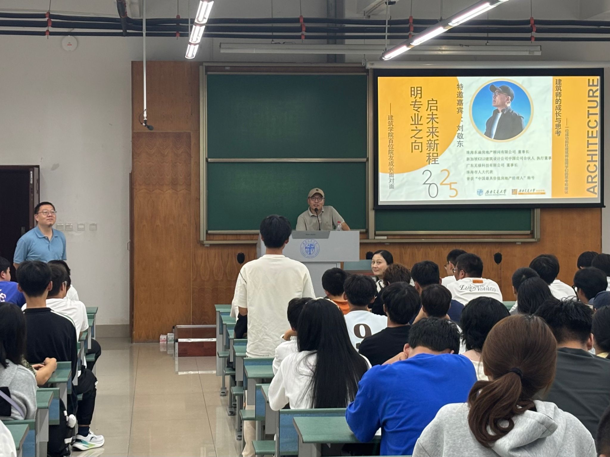 分享过程中,刘敬东学长从自身“斜杠建筑师”的职业路径出发,结合建筑设计项目实践、地产行业运营管理、科技领域布局的多元经历,为同学们解析了建筑师职业发展的多种可能性。他详细介绍了从建筑设计基础能力培养,到跨界整合资源、拓展行业视野的成长要点,重点分享了他的创业经历,以及与国外合作的作品。同时,他也讲述了自身在职业转型中遇到的挑战与应对方法,从建筑转到科技,让同学们深刻认识到建筑行业发展的多元性与综合性。