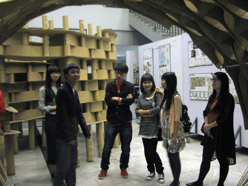 图书馆前的pvc管桌椅处,胡文韵同学就图书馆pvc家具系列的设计过程和表现形式为例进行了生动有趣的讲解,在场同学也现场一一体验了建造节模型内部空间,感受这种艺术气息和文化氛围,同时对九色视频