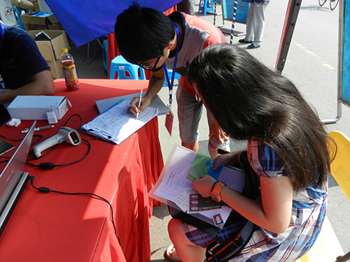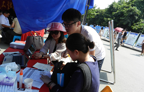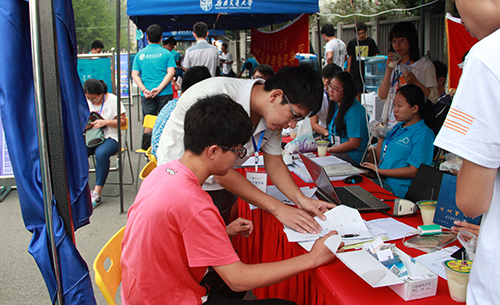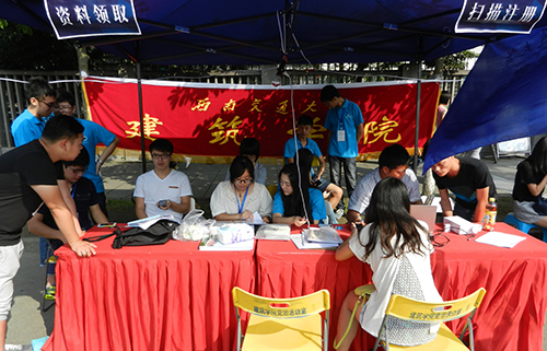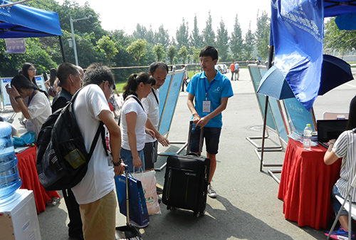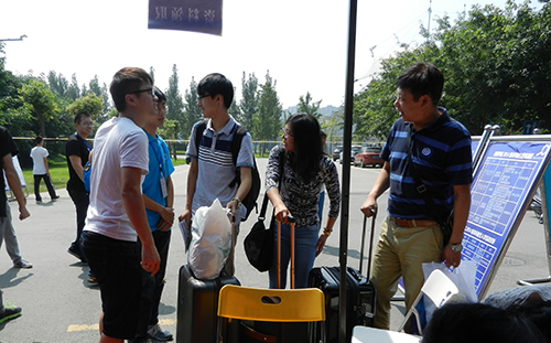 迎新点的班主任与志愿者们正等待着新生们前来报到注册