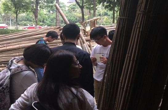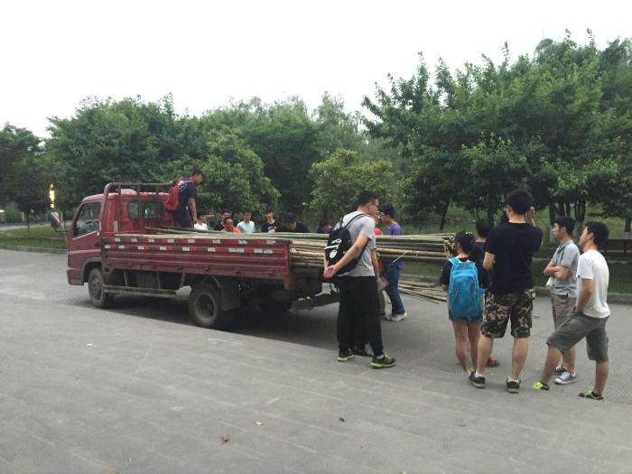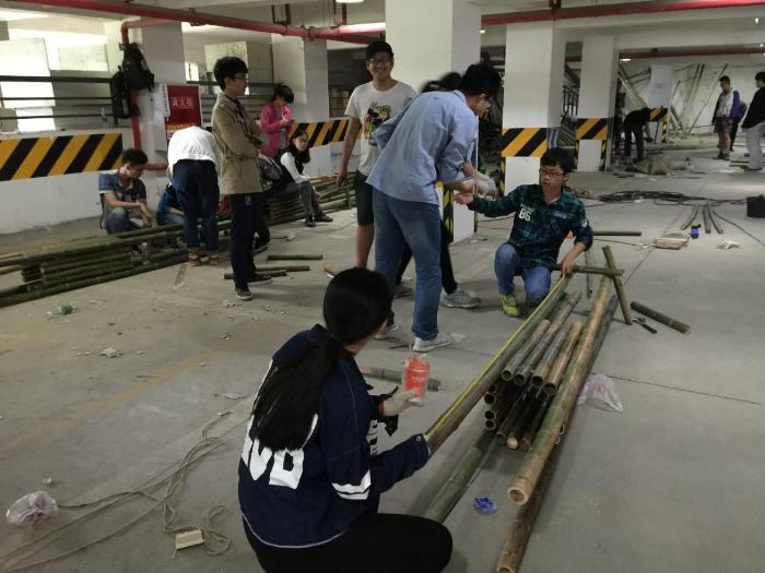 5月5日下午六点钟,在经过了昨日的准备活动以及休整后,定好的竹子等材料已经由卡车运送到了建筑与设计学院门口,大家在志愿者们的帮助下搬运和分配好了材料,开始了建造节前的初期搭建。