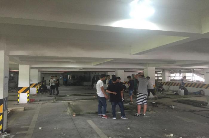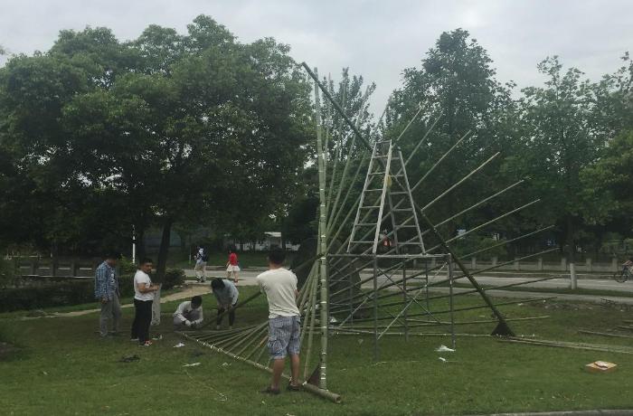 5月6日,是建造节第三天。尽管烈日炎炎,却丝毫未能影响外校同学们对于建造比赛的信心与热情。成都理工大学的同学们在早上八点半就来到了位于八教地下停车场的建造地点,开始了对竹子的加工与改造。到下午五点钟的时候,他们已经竖起了几根并排高低错落的长竹子,最高的竹子足有三米九,被搭成了篝火形状。经过一下午的努力,他们的方案造型已经初见端倪。