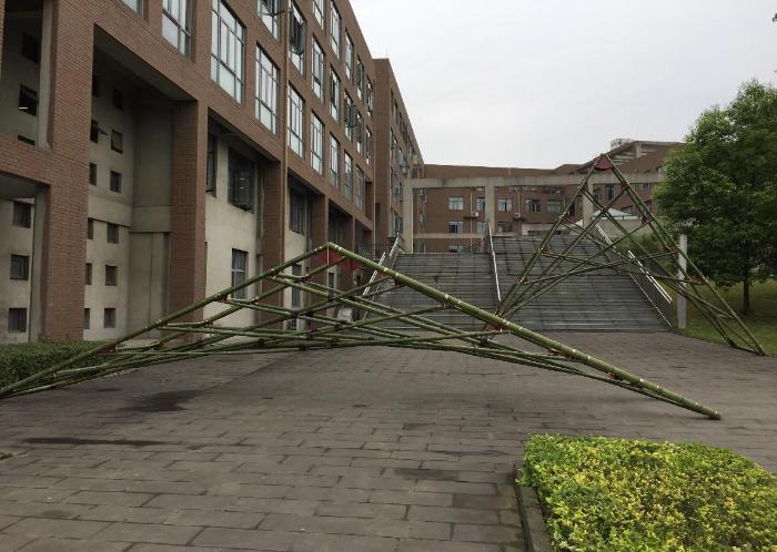 西南民族大学别具一格的选择了木头作为主材料,而成都理工大学的同学们则已经将作品完成大半,并搬至室外进行一些加工,他们将多变而柔软的绳索与坚硬挺直的竹子结合在一起,别具韵味。