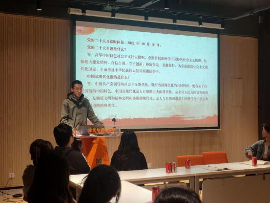 紧接着,罗勋锐老师带领全体成员进行了中共二十大精神的学习,对党的二十大精神进行了详细讲解,介绍了大会主题、五大原则、必由之路等内容。讲解过程中罗老师提到,作为新时代的大学生,我们应该把小我融入大我,对国之大者做到心中有数,大如关心党和国家,小如关心学院学校。我们应该肩负起社会责任,而不是做一名精致的利己主义者。