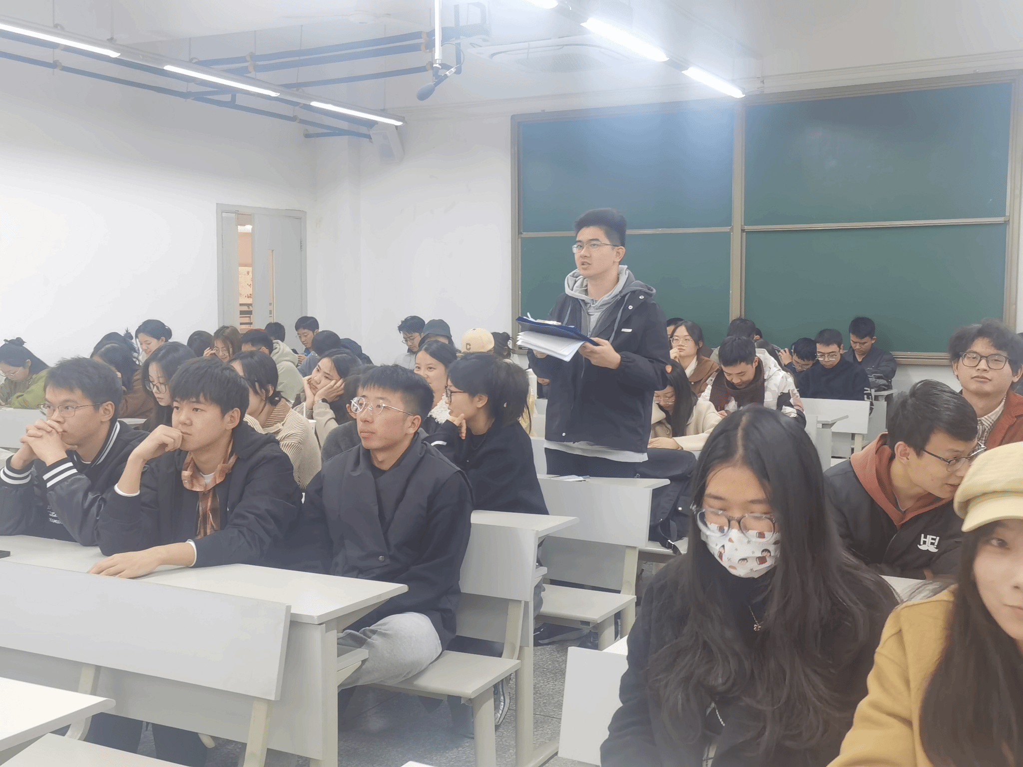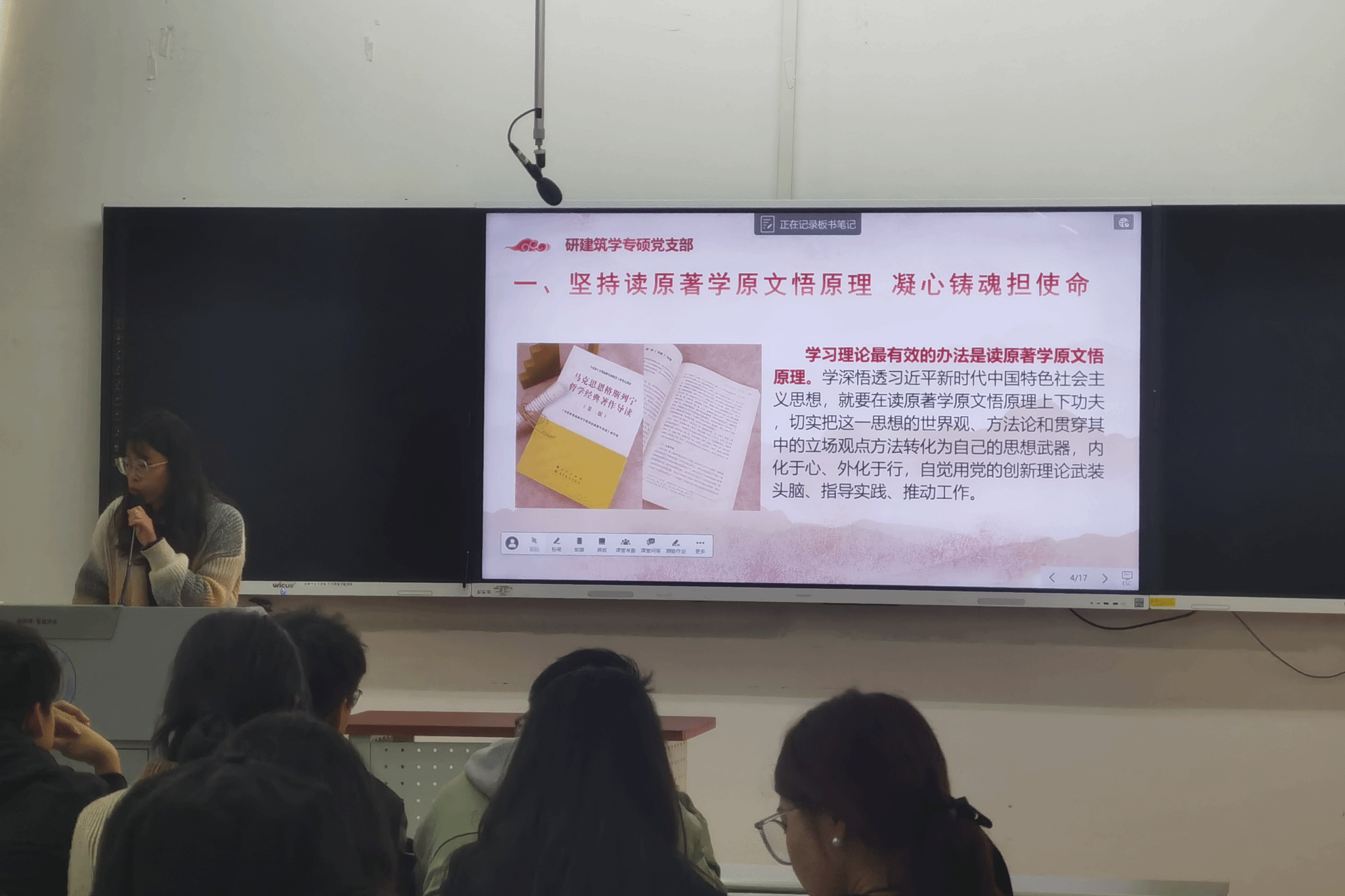 2023年11月16日16时至17时,研建筑学专硕党支部在X8323教室展开了“读原著、学原文、悟原理、凝心铸魂担使命”的组织生活会。本次组织生活会有四个环节,分别为:学习“读原著、学原文、悟原理”的重要性、“马克思主义经典原著及习近平总书记治国理政思想”相关图书知识分享、“交流与讨论”环节和“读原著、学原文、悟原理”活动介绍。本次活动由研建筑学专硕党支部委员谢仕菊同志主持,研建筑学专硕党支部全体党员和积极分子共同参加。