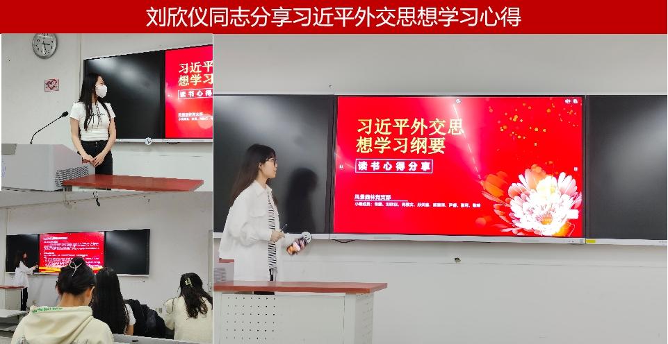 会议伊始,杜璇同志基于习近平新时代中国特色社会主义思想相关内容分配学习小组,各小组围绕专题结合国际热点确定学习内容。本次学习分享会邀请刘欣仪、宋昊翔同志代表其学习小组进行思想学习纲要分享。刘欣仪同志从习近平外交思想的背景及意义切入,以“六个感悟”为主线,沿着习近平总书记的外交足迹向大家讲述了学习习近平外交思想的感悟,同时还列举了谢峰、华春莹等优秀外交官在国际交涉中不忘责任与使命的故事。